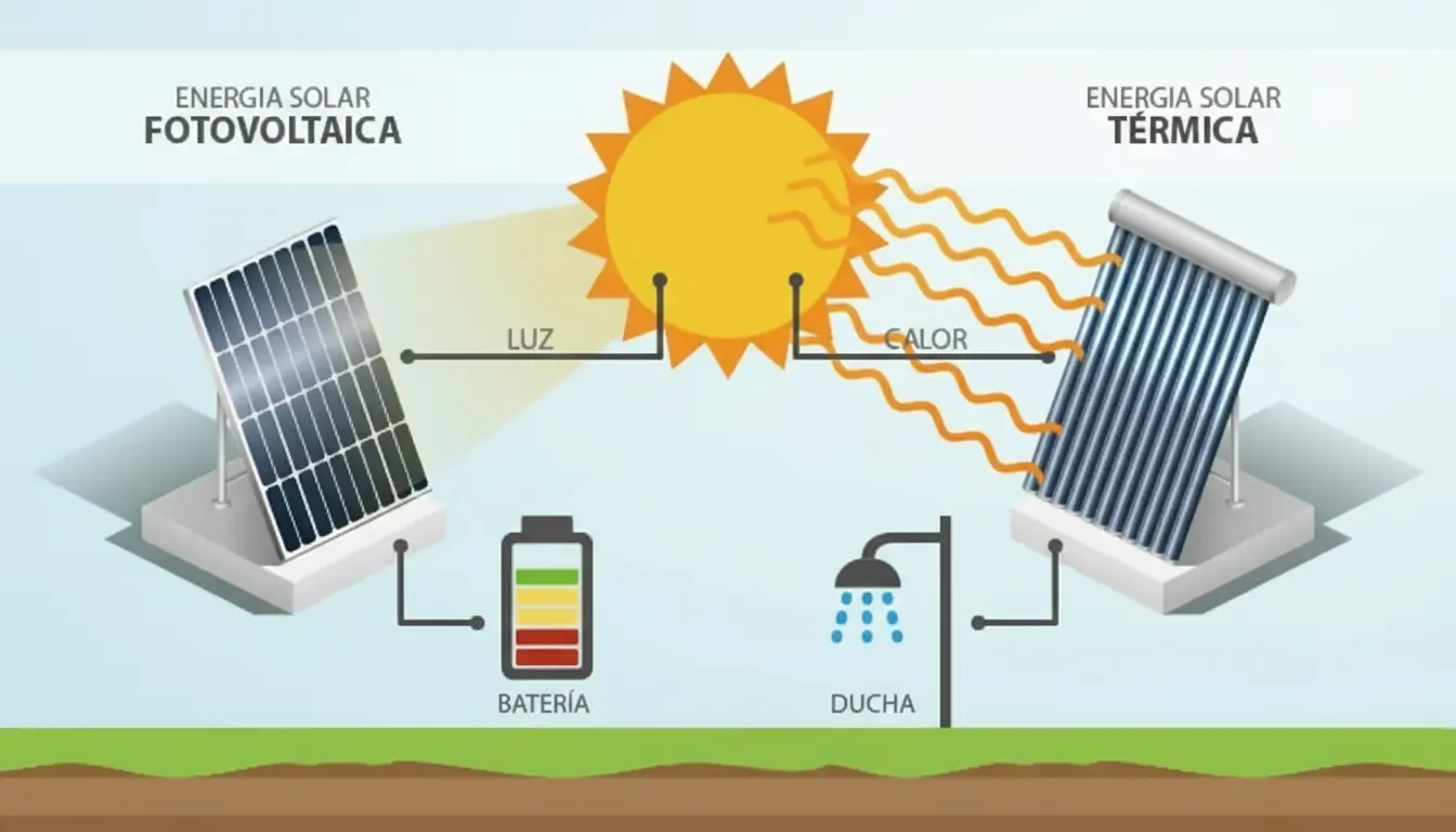 Esquema comparativo: energía solar fotovoltaica (izquierda) vs térmica (derecha).